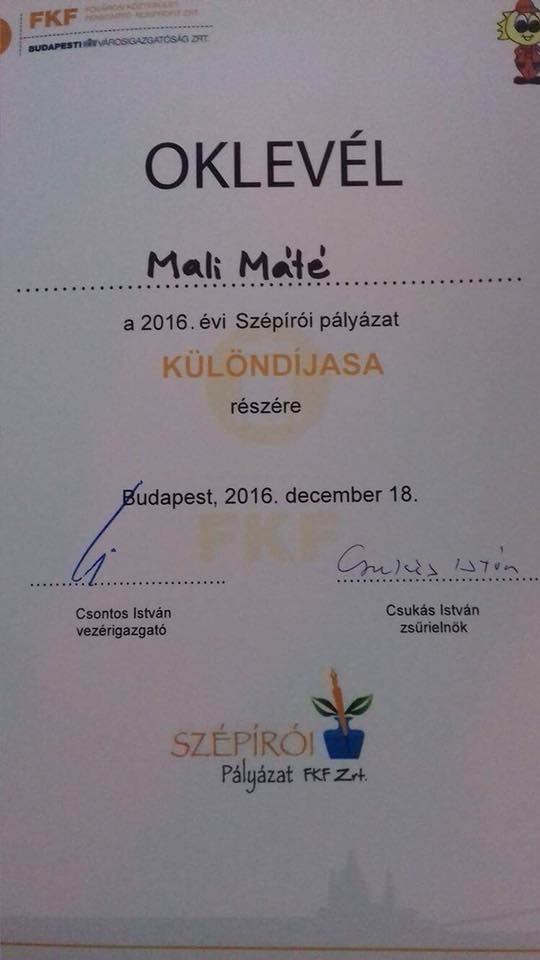 Az ünnepélyes átadóra 2016. 12.18-án, vasárnap került sor Budapesten. Mali Máté különdíjban is részesült, melyet a zsűri elnöke, Csukás István adott át.