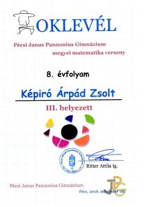 A Pécsi Janus Pannonius Gimnázium által szervezett megyei matematikaversenyen 3. helyezést ért el a nyolcadikosok között Képíró Árpád Zsolt!