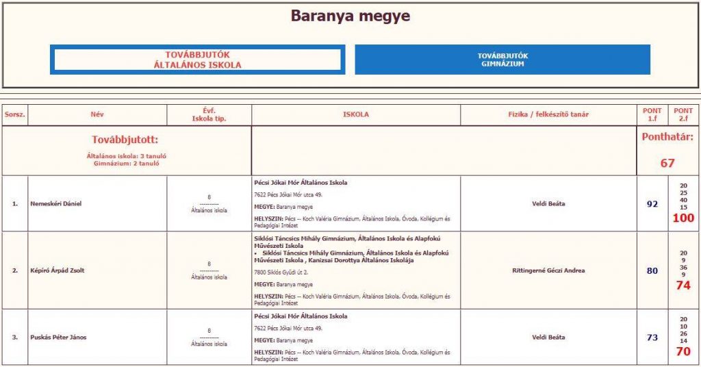 Baranya megyéből mindössze 3 tanuló került be a verseny III. fordulójába, ahol a második fordulóban is szereplő teszt-, számításos, és fizikatörténeti feladatokon kívül már fizikai mérőkísérleti feladat és fizikai jelenség elemző feladat is vár a versenyzőkre.