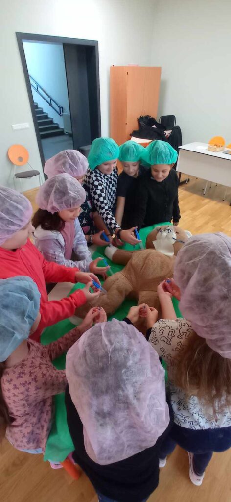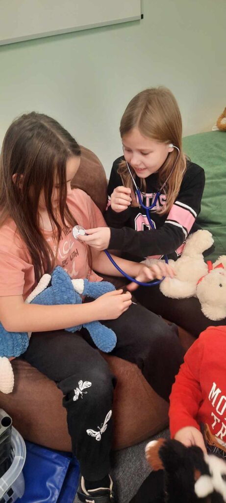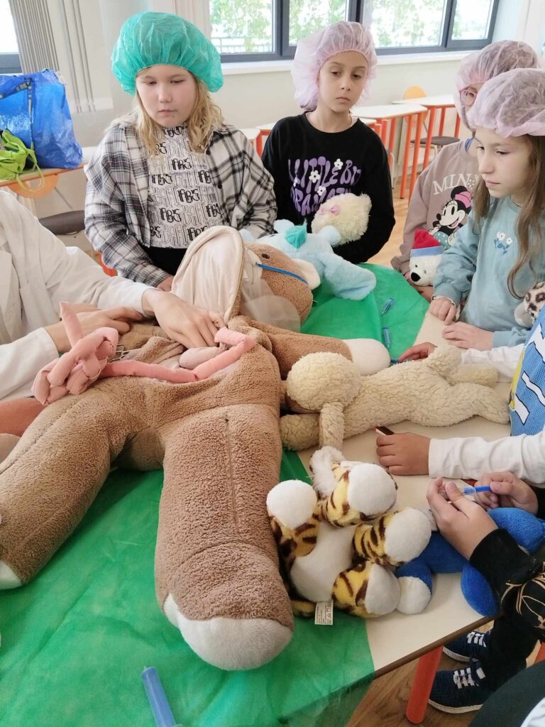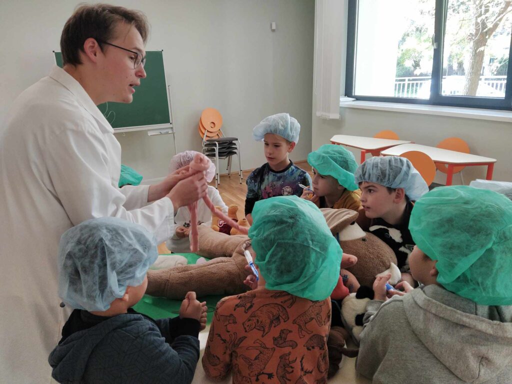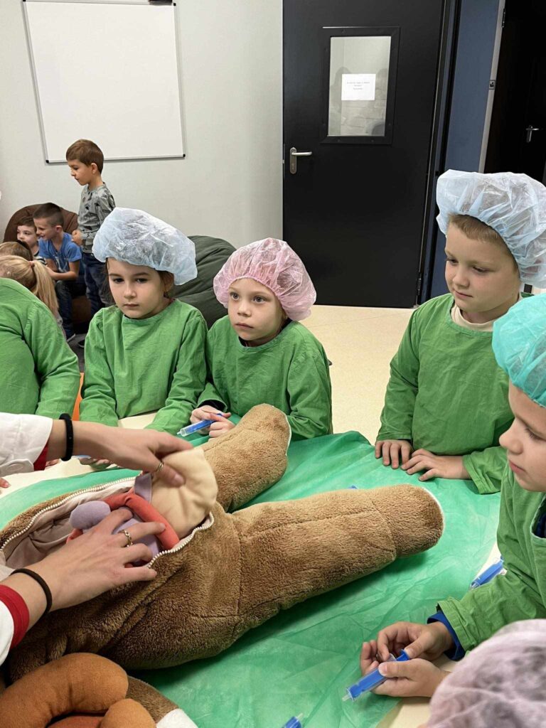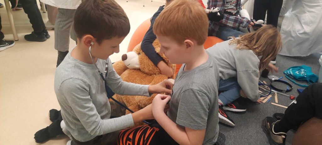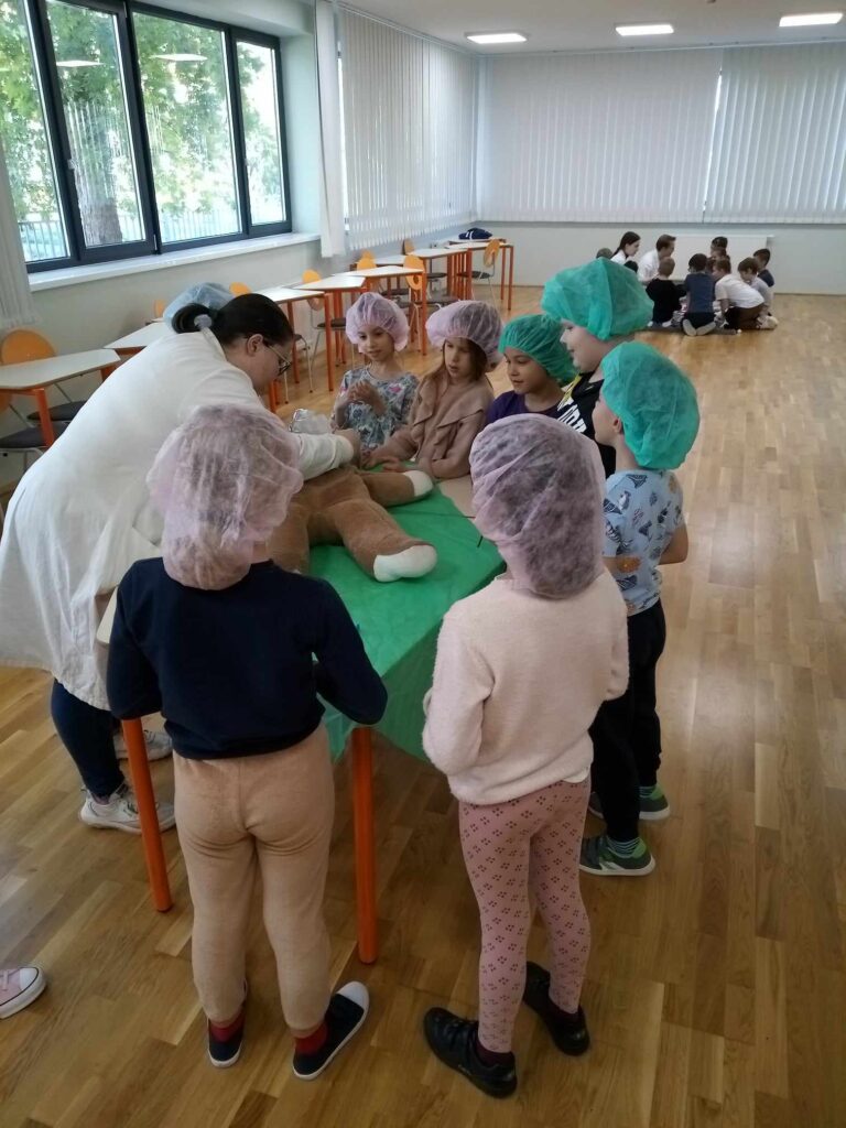 2023.11.13-án a Teddy Maci Kórház Pécs „orvosai” látogatták meg alsó tagozatos tanulóinkat. A játékos program keretében a gyerekek megnézhették, kézbe vehették és ki is próbálhatták a gyermekrendelőben előforduló eszközöket. „Teddy doktor és doktor nénik” segítségével együtt megvizsgálták és meggyógyították plüss kedvenceiket. A Teddy Maci Kórház különleges felszereléseinek köszönhetően, a gyermekek, speciális öltözékben, egy „maci-műtétet” is elvégezhettek, miközben a testben rejtőző szervekkel és azok működésével is megismerkedhettek. Köszönjük szépen a Teddy Maci Doktorainak ezt a fantasztikus programot!