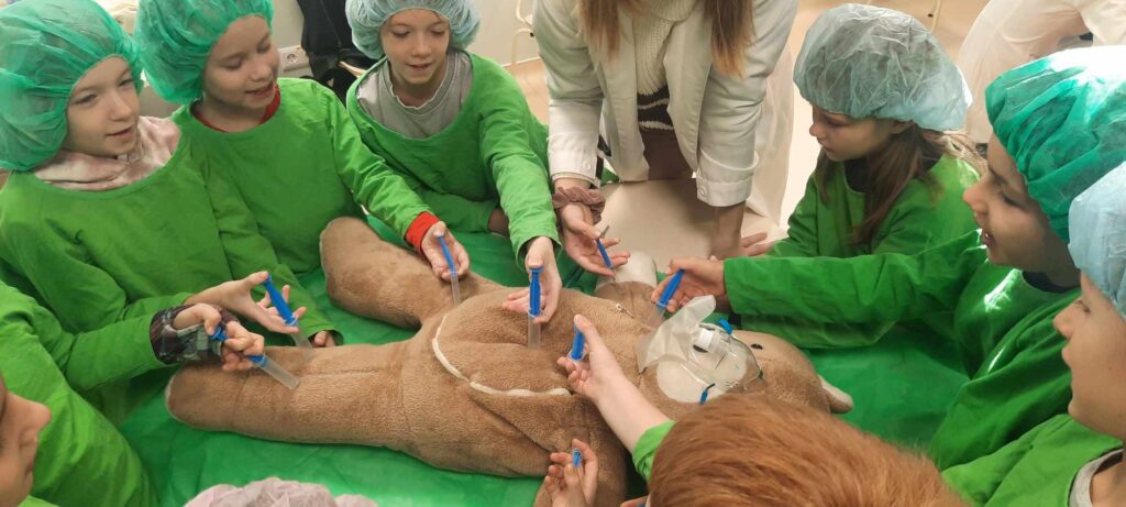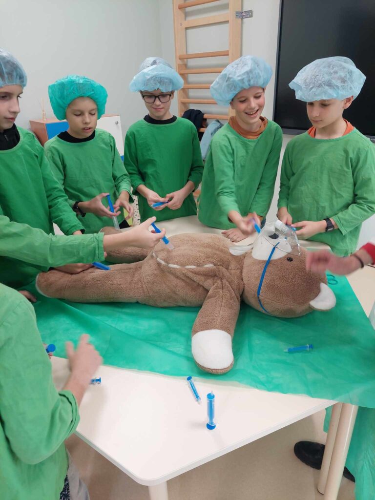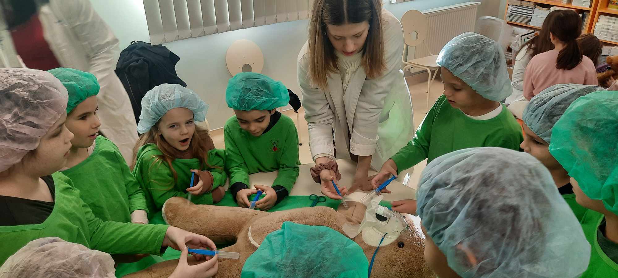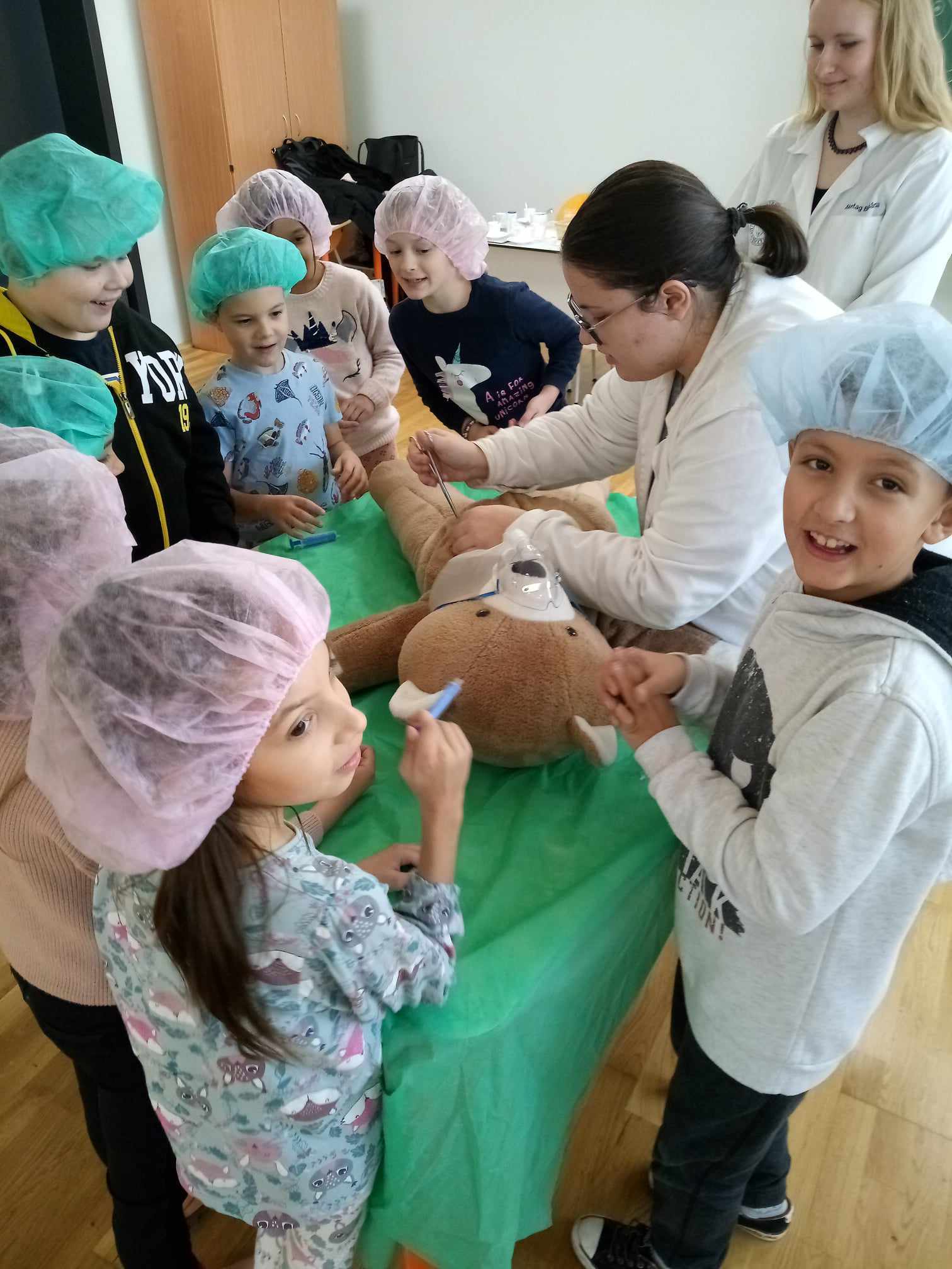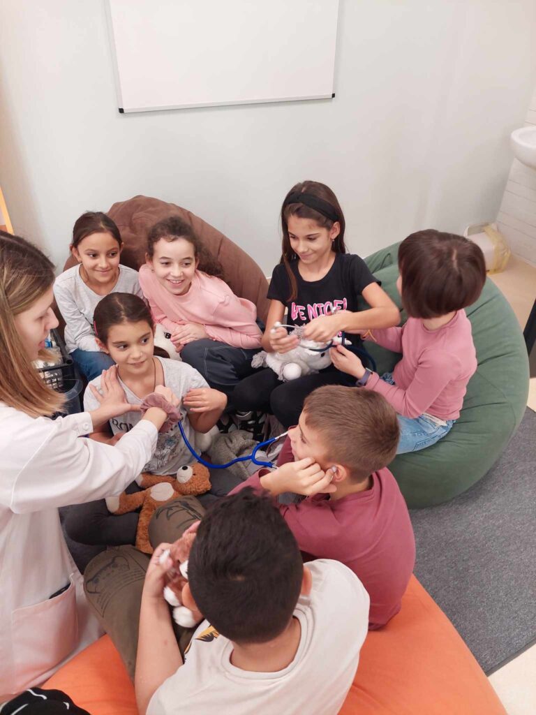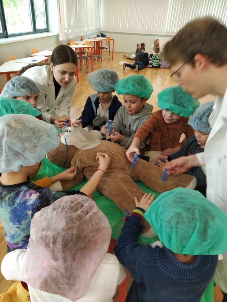 2023.11.13-án a Teddy Maci Kórház Pécs „orvosai” látogatták meg alsó tagozatos tanulóinkat. A játékos program keretében a gyerekek megnézhették, kézbe vehették és ki is próbálhatták a gyermekrendelőben előforduló eszközöket. „Teddy doktor és doktor nénik” segítségével együtt megvizsgálták és meggyógyították plüss kedvenceiket. A Teddy Maci Kórház különleges felszereléseinek köszönhetően, a gyermekek, speciális öltözékben, egy „maci-műtétet” is elvégezhettek, miközben a testben rejtőző szervekkel és azok működésével is megismerkedhettek. Köszönjük szépen a Teddy Maci Doktorainak ezt a fantasztikus programot!